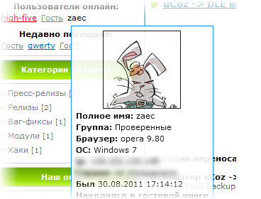 Модуль он-лайн для uCoz, подобно аналогу на DLE, выводит имя, аватар, браузер, ОС, ip, время и место нахождения пользователя на сайте. Что нового в 3-ей версии: